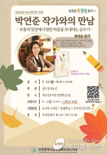 (케이엠뉴스) 인천광역시교육청화도진도서관은 9월 22일 오후 7시부터 9시까지 평생학습1실에서 박연준 작가와의 만남을 운영한다.