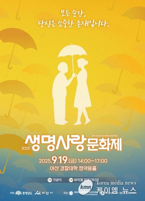 (케이엠뉴스) 충남도는 오는 19일 아산 경찰대학교 정약용홀에서 자살예방 인식개선 및 생명존중 문화확산을 위한 ‘2025년 생명사랑문화제’를 개최한다고 4일 밝혔다.