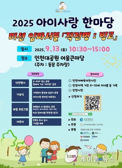 (케이엠뉴스) 인천광역시는 인천시와 인구보건복지협회 인천지회가 공동 운영하는 인천아빠육아천사단이 주관하는 ‘2025 아이사랑 한마당, 미션 임파서블’ 행사가 오는 9월 13일 오전 10시 30분부터 오후 3시까지 인천대공원 어울큰마당에서 열린다고 밝혔다.