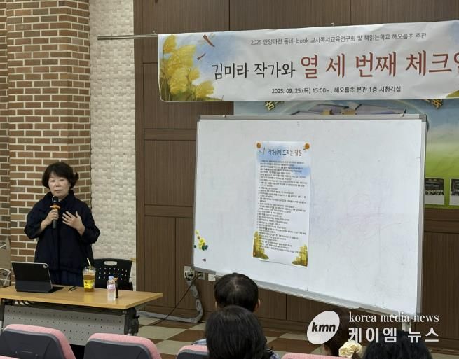 (케이엠뉴스) 안양과천 동네-book 교사 독서 교육연구회는 9월 25일 안양 해오름초등학교 1층 시청각실에서 독서 교육연구회 회원 및 안양, 군포 관내 희망 교직원들을 대상으로 ‘열두 번째 체크인’으로 알려진 김미라 작가와의 만남을 가졌다.