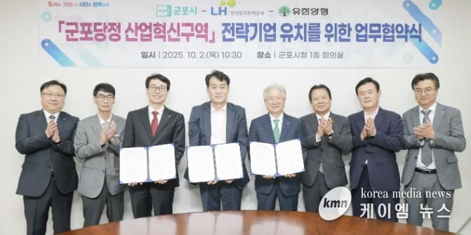 (케이엠뉴스) 군포시는 2일 군포시청에서 한국토지주택공사(LH), ㈜유한양행과 ‘군포당정 산업혁신구역’ R·D 전략기업 유치를 위한 업무협약을 체결했다고 밝혔다.