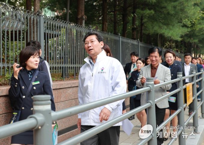 (케이엠뉴스) 이상일 용인특례시장은 2일 오전 수지구 죽전로 대청초등학교 사거리 횡단보도에서 등교시간에 맞춰 진행된 어린이 교통지도 봉사에 참여하고 학교 주변통학로를 둘러보며 일부 시설 개선을 지시했다.