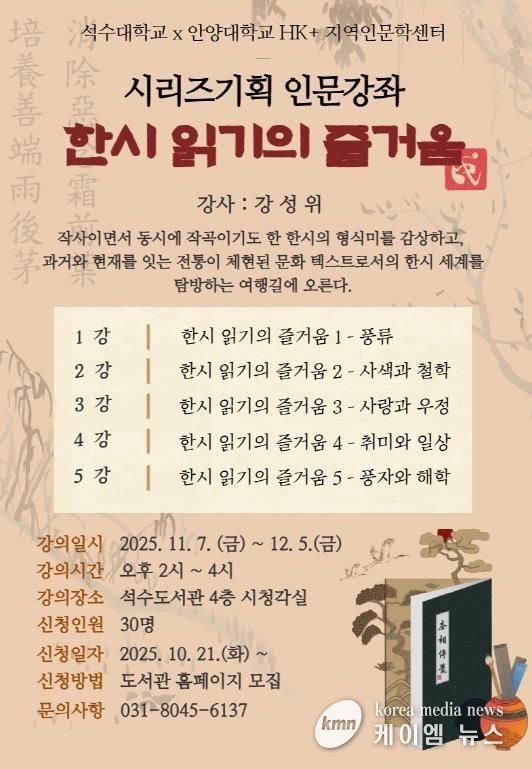 (케이엠뉴스) 안양시 석수도서관은 안양대학교 HK+사업단 지역인문학센터와 함께 시리즈기획 인문강좌의 일환인‘한시 읽기의 즐거움’ 강좌를 오는 11월 7일부터 12월 5일까지 운영한다고 17일 밝혔다.
