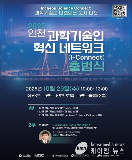 (케이엠뉴스) 인천광역시는 10월 29일 쉐라톤 그랜드 볼룸에서 ‘인천 과학기술인 혁신 네트워크(i-connect)’출범식을 개최하고, 지역 과학기술 주체 간 협력기반 강화를 위한 본격적인 행보에 나섰다고 밝혔다.