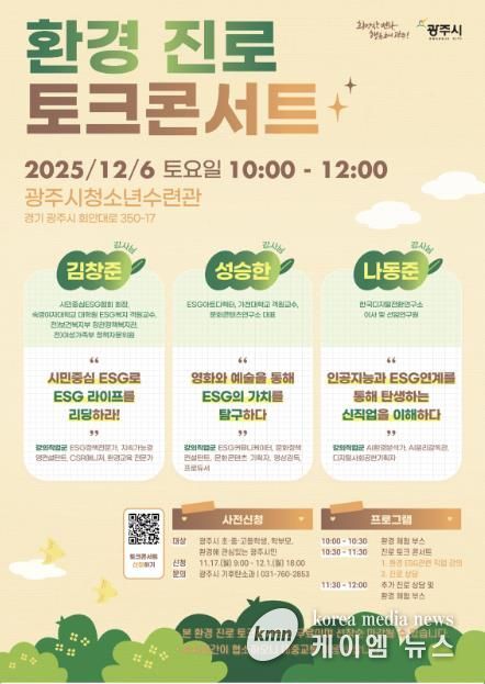 (케이엠뉴스) 광주시는 오는 12월 6일 청소년수련관에서 환경 분야 전문 직업인을 초청해 특강과 진로상담을 진행하는 ‘환경 진로 토크콘서트’를 개최한다고 14일 밝혔다.