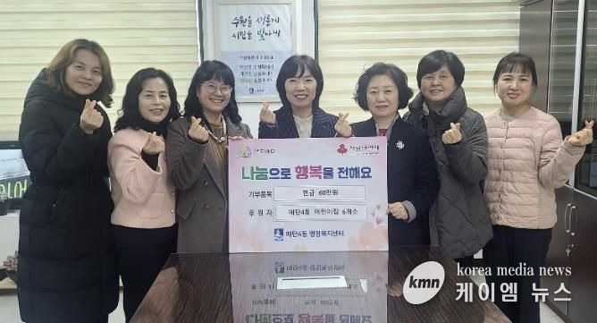 민상희 매탄4동장은 “어린이집 원장님들께서 보여주시는 꾸준한 이웃사랑이 우리 아이들에게 좋은 본보기가 되고 있다”며 “전달된 성금은 따뜻한 마음이 온전히 전해질 수 있도록 꼭 필요한 곳에 소중하게 사용하겠다”고 감사의 마음을 전했다.