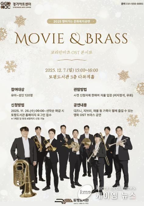 (케이엠뉴스) 구리시 토평도서관은 OST 콘서트 'Movie & Brass'의 무료 관람 사전 신청을 11월 26일 오전 9시부터 구리시립도서관 홈페이지를 통해 선착순으로 신청받는다고 밝혔다. 관람 정원은 유아부터 성인까지 총 120명이다.