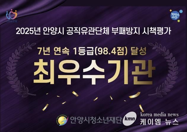 (케이엠뉴스) 안양시청소년재단이 2025년 안양시 공직유관단체 부패방지 시책평가에서 7년 연속 최우수기관으로 선정됐다. 재단은 이번 평가에서 총점 98.4점이라는 높은 점수를 획득하며, 안양시 7개 공직유관단체 중 최고 수준의 청렴도와 투명성을 다시 한번 입증했다.