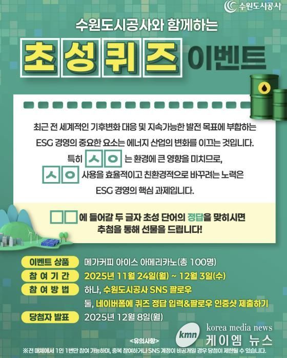 (케이엠뉴스) 수원도시공사는 ESG 경영 선도 일환으로 기후변화 대응과 관련한 SNS 이벤트를 실시한다고 24일 밝혔다.