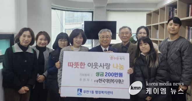 (케이엠뉴스) 수원시 팔달구 우만1동은 지난 24일, 사단법인 한국자원복지재단 사무실에서 관내 취약계층 지원과 복지사각지대 해소를 위해 활용될 성금 200만 원을 전달받았다.
