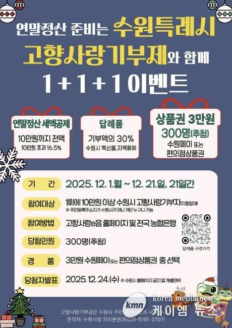 (케이엠뉴스) 수원특례시가 고향사랑기부제 참여자 중 300명을 추첨해 상품권을 제공하는 연말 이벤트를 진행한다.