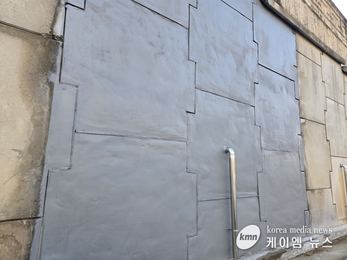 현장 사진 분석 결과, 기존에는 옹벽 전면부 다수 구간에서 보강 전 미도장 상태, 보수 흔적 없는 회색 패치, 철근 부식 흔적이 확인됐으며, 일부 구간은 임시 보수조차 이뤄지지 않은 상태로 방치돼 있었다.
