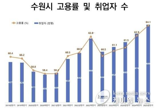 통계청이 발표한 2025년 상반기 수원시 고용률은 64.1%다. 수원시에 살고 있는 15세 이상 시민 100명 중 64명이 수입을 목적으로 일을 하고 있다는 의미다.