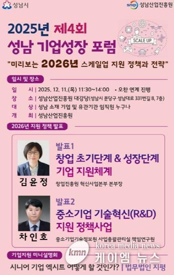 (케이엠뉴스) 성남산업진흥원은 '2026년 스케일업 지원 정책'을 주제로 오는 12월 11일 11시 30분부터 2025년 제4회 '성남기업성장포럼'을 개최한다.