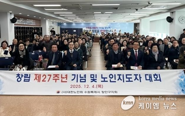 (케이엠뉴스) 대한노인회 수원시장안구지회는 지난 4일 장안구청 대회의실에서 창립 27주년을 기념하는 ‘2025년 노인지도자 대회’를 개최했다.