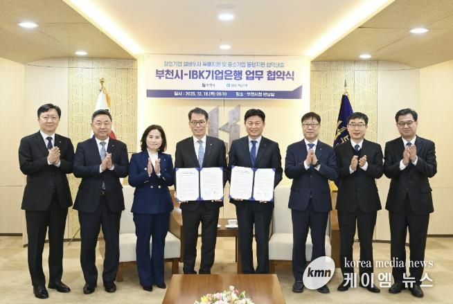 (케이엠뉴스) 부천시와 IBK기업은행이 12월 18일 ‘창업기업 설비투자 특별지원’ 및 ‘중소기업 동행지원 협약대출’ 업무협약을 체결했다. 협약식에는 조용익 부천시장과 김성태 IBK기업은행장을 비롯한 양 기관 관계자가 참석했다.