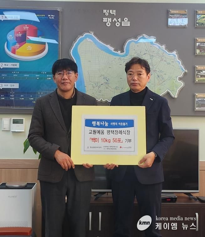 (케이엠뉴스) 평택시에 있는 교원예움 평택장례식장은 지난 18일, 팽성읍 행정복지센터를 방문해 지역의 어려운 이웃에게 전달해 달라며 백미(10㎏) 50포를 기부했다.