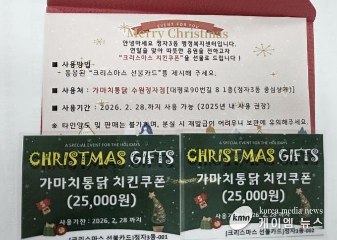 (케이엠뉴스) 수원시 장안구 정자3동은 지난 18일 관내 저소득 한부모가족 33세대에 치킨쿠폰을 전달하며 연말 온정을 전했다.