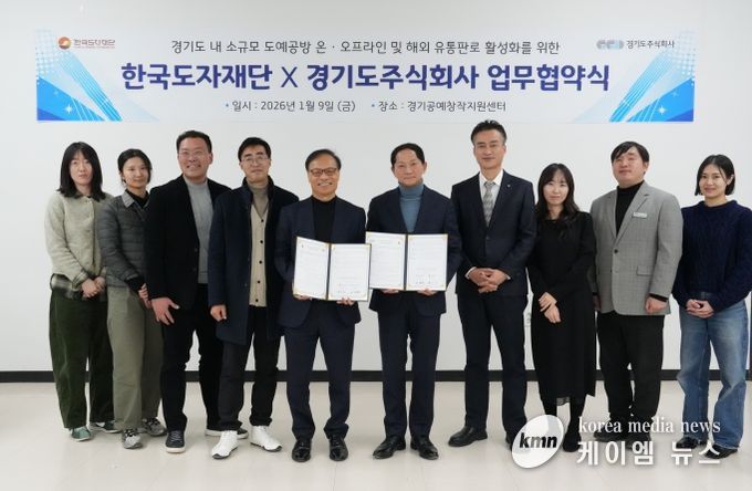 (케이엠뉴스) 한국도자재단과 경기도주식회사가 9일 경기공예창작지원센터에서 ‘경기도 소규모 도예공방의 유통판로 활성화’를 위한 업무협약을 체결했다.