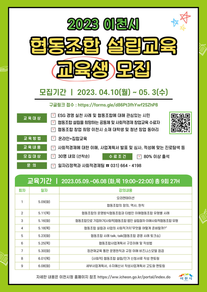 이천시는 지역사회 공동체 문제를 스스로 해결하고, 지역경제 활성화 등 시대적 요구에 부응하는 협동조합의 이해 고취 및 설립을 목표로 하여 “2023년 협동조합 설립교육”을 5월 9일부터 진행한다.