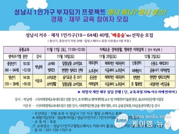 (케이엠뉴스) 성남시는 1인 가구의 재무상담 및 생활경제교육을 위한 특별 교육프로그램을 11일부터 매주 토요일 4주간 운영한다고 6일 밝혔다.
