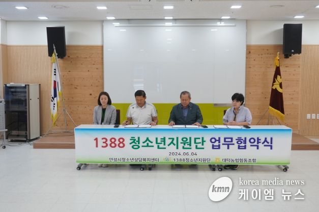 (케이엠뉴스) 안성시청소년상담복지센터는 대덕농업협동조합, 1388청소년지원단장, 1388청소년지원단부단장이 참석한 가운데, 위기청소년 지원 연계 구축을 위해 지난 6월 4일 업무협약을 체결했다.