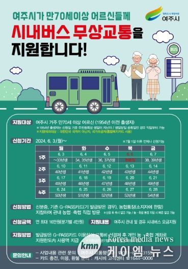 (케이엠뉴스) 경기 여주시는 70세 이상 어르신들을 대상으로 하는 시내버스 무상교통 지원사업을 오는 7월 1일부터 본격 시행한다고 전했다. 이번 사업은 고령화 사회에 발맞춰 어르신들의 교통비 부담을 줄이고, 이동권을 보장함으로써 삶의 질 향상을 위해 마련됐다.