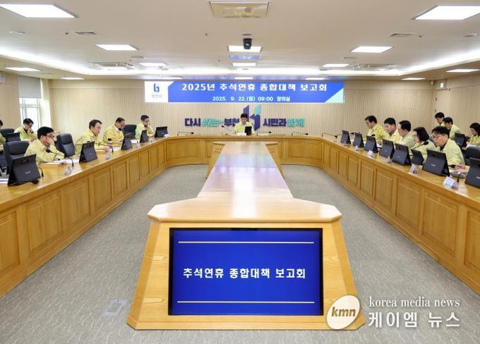 (케이엠뉴스) 부천시는 지난 22일 시청 창의실에서 조용익 시장을 주재로 부시장을 비롯한 국장과 부서장이 참석한 가운데 ‘2025년 추석 연휴 종합대책 보고회’를 열었다. 이번 보고회는 7일간 이어지는 추석 연휴를 앞두고 시민 생활 전반에 걸친 분야별 대책을 점검하기 위해 마련됐다.