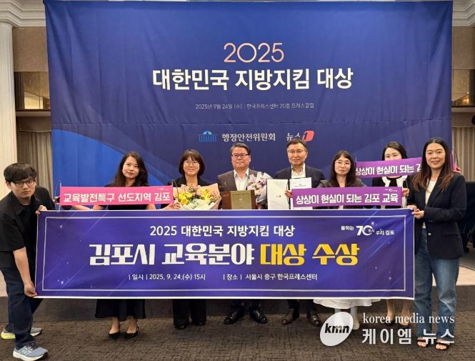 (케이엠뉴스) 김포시가 9월 24일 서울 프레스센터에서 열린 '2025 대한민국 지방지킴 대상' 시상식에서 교육 부문 대상을 수상했다. 이번 행사는 뉴스1과 국회 행정안전위원회가 공동 주최했으며, 인구·돌봄·정주여건·교육 등 9개 분야에서 지방소멸 대응에 기여한 우수 지자체를 선정·시상했다.