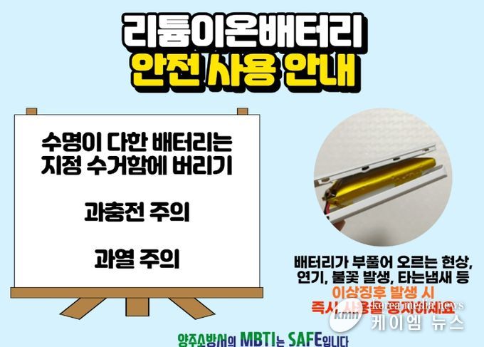 (케이엠뉴스) 양주소방서는 리튬이온배터리의 안전한 사용을 유도하고 관련 화재 사고를 예방하기 위해, 시민 누구나 쉽게 이해할 수 있는 시각자료 형태의 안내 이미지를 제작해 홍보에 나섰다고 밝혔다.