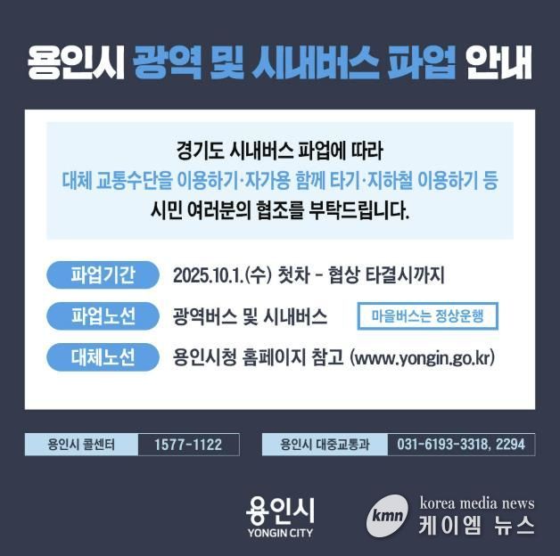 (케이엠뉴스) 용인특례시는 경기도버스노동조합협의회가 10월 1일부터 임금 협상 타결 전까지 운행을 전면 중단하겠다고 예고함에 따라 시민 불편을 최소화하기 위해 전세버스 30대를 투입하는 등 비상수송대책을 마련했다고 30일 밝혔다.