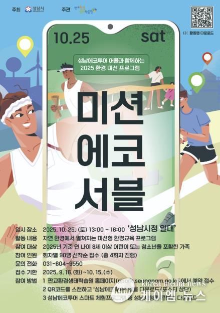 (케이엠뉴스) 성남시는 오는 10월 25일 오후 1시~4시 시청 곳곳에서 가족 단위 초·중학생 120개 팀(팀당 2~4명, 총 360명)이 참여하는 ‘미션에코서블’ 프로그램을 진행한다.