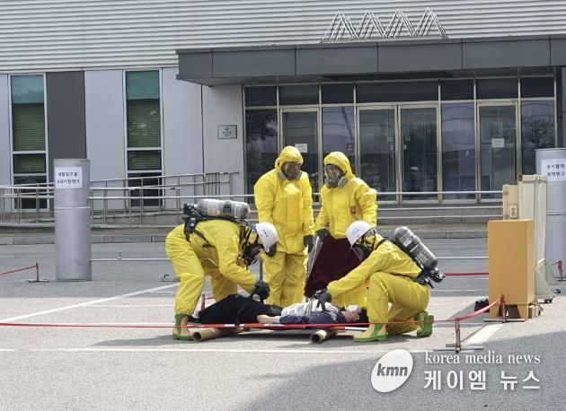 유해화학물질인 메틸 알코올 누출로 인한 화재 상황을 설정해 진행한 이 훈련은 자체 매뉴얼에 따라 ▲비상 상황 긴급전파 ▲소방대 초동 조치 ▲화재 진압 ▲인명구조 ▲사고 복구 등으로 구성됐다.