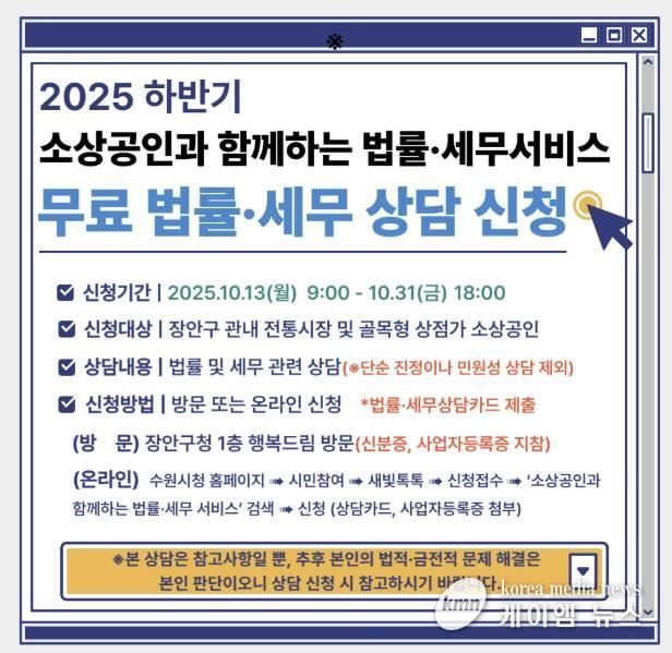 (케이엠뉴스) 수원시 장안구는 오는 10월 13일부터 법률·세무 상담을 받기 어려운 관내 전통시장 및 골목형 상점가 소상공인을 대상으로 쉽고 편리하게 상의할 수 있는 무료 상담인 ‘소상공인과 함께하는 법률·세무 서비스’ 사업을 운영한다.