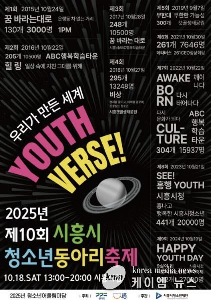(케이엠뉴스) 10주년을 맞은 시흥시청소년동아리축제가 오는 10월 18일 시흥시청에서 개최된다. ‘우리가 만든 세계: YOUTHVERSE’를 주제로 열리는 이번 축제는 지난 10년간의 활동을 돌아보는 동시에 앞으로 축제가 나아가야 할 길을 내다보는 전환점이 될 것으로 보인다.