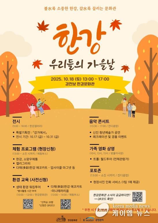 (케이엠뉴스) K-water한강보관리단과 케이워터운영관리 한강문화관은 오는 10월 18일 가족과 이웃이 함께 즐기는 대표 문화축제 “한강, 우리들의 가을날”를 개최한다고 밝혔다