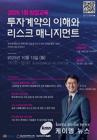 교육은 2025년 10월 13일 충남창업마루나비에서 진행되며, 류재언 변호사(법무법인 율본)가 강사로 참여해 스타트업 컴플라이언스 원칙, 투자계약 주요 조항, 리스크 관리 및 법적 책임, 투자계약 필수 체크사항 등을 상세히 강의할 예정이다.