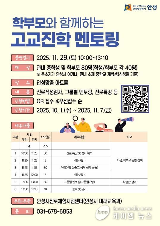 (케이엠뉴스) 안성시는 오는 11월 29일 오전 10시, 안성맞춤 아트홀에서 관내 중학생과 학부모를 대상으로 ‘학부모와 함께하는 고교진학 멘토링’을 실시한다고 밝혔다.