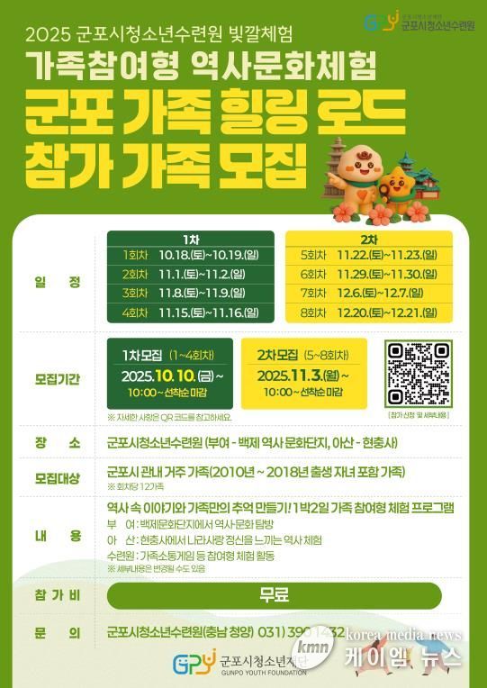 (케이엠뉴스) 군포시청소년재단이 운영하는 군포시청소년수련원(충남 청양)은 관내 가족을 대상으로 2025년 가족참여형 역사문화탐방 '군포가족 힐링로드' 참가자를 모집한다.