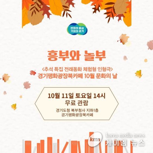 ‘북카페 문화의 날’은 경기도가 매달 경기평화광장 북카페에서 도민과 공직자가 함께 책과 공연을 즐기며 일상 속에서 문화와 여가를 누릴 수 있도록 마련한 정기 프로그램이다. 이번 10월 행사는 온 가족이 함께 공감하고 참여할 수 있는 전래동화 기반 인형극으로 구성돼, 전 세대가 공감할 수 있는 내용으로 꾸며진다.