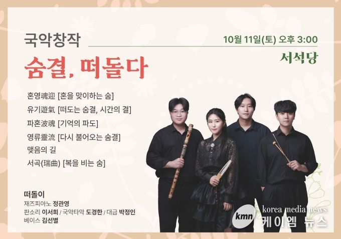 (케이엠뉴스) 광주문화재단(대표이사 노희용) 전통문화관은 오는 10월 11일 오후 3시, 토요 상설공연 22회차로 퓨전국악 단체 떠돌이의 '숨결, 떠돌다' 무대를 선보인다.