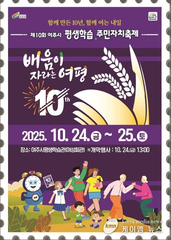 (케이엠뉴스) 여주시는 오는 10월 24일부터 25일까지 이틀간 여주시평생학습관 일원에서 '제10회 여주시 평생학습·주민자치축제'를 개최한다. '배움이 자라는 여평 – 함께 만든 10년, 함께 여는 내일'을 주제로 열리는 이번 축제는 평생학습도시 여주시가 지난 10년간 시민과 함께 쌓아온 학습의 성과를 나누고, 앞으로의 10년을 새롭게 열어가는 의미 있는 자리로 마련됐다.
