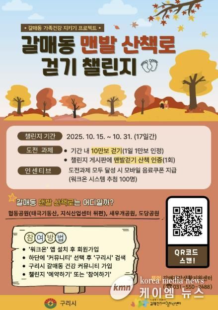 (케이엠뉴스) 구리시는 가을철 주민들의 건강한 생활 습관 형성과 스트레스 완화를 위해 ‘갈매동 맨발 산책로 걷기 챌린지’를 오는 10월 15일부터 31일까지 17일간 운영한다고 밝혔다.