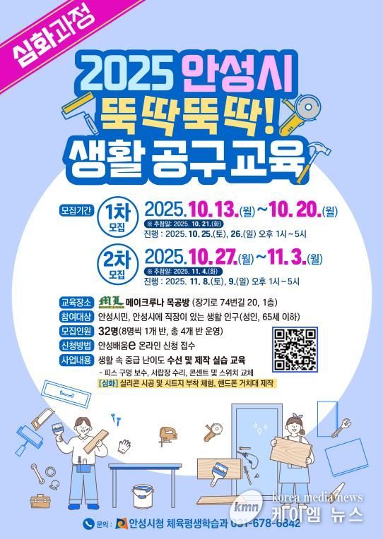 (케이엠뉴스) 안성시는 시민들의 생활 자립 역량 강화를 위해 '뚝딱뚝딱 생활 공구[심화과정] 교육'을 오는 10월 25~26일과 11월 8~9일, 총 2회 주말 일정으로 운영한다고 밝혔다.