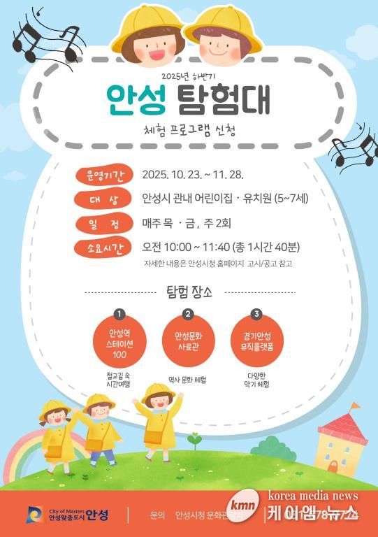 (케이엠뉴스) 안성시는 상반기에 시범 운영해 큰 호응을 얻은 유아 대상 체험형 프로그램 ‘안성 탐험대: 역사 속으로, 음악 속으로!’를 하반기에도 운영하며, 지역 문화시설 활성화에 나선다.