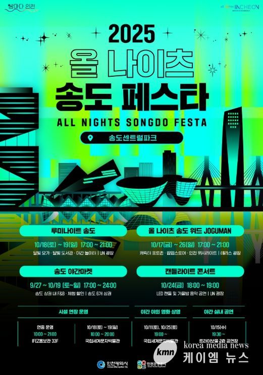(케이엠뉴스) 인천광역시와 인천관광공사는 오는 10월 17일부터 26일까지 송도센트럴파크 일대에서 '2025 올 나이츠 송도 페스타'를 개최한다고 밝혔다.
