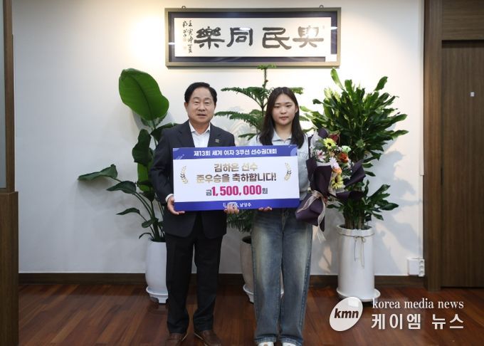 (케이엠뉴스) 남양주시는 10월 13일 시장 집무실에서 ‘제13회 세계 여자 3쿠션 선수권대회’ 준우승을 차지한 김하은 선수에게 포상금 150만 원을 전달했다고 밝혔다.