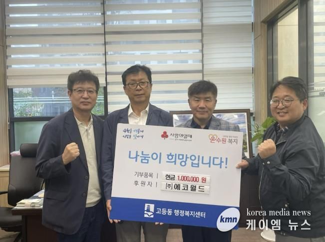 (케이엠뉴스) 수원시 팔달구 고등동은 10월 13일, 사회적기업 ㈜에코월드로부터 관내 취약계층을 위한 이웃돕기 성금 100만원을 전달받았다고 밝혔다.