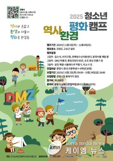 (케이엠뉴스) 광명시는 전국남북교류협력지방정부협의회가 주최·주관하는 ‘2025 청소년 역사·평화·환경캠프’에 참가할 청소년을 모집한다.