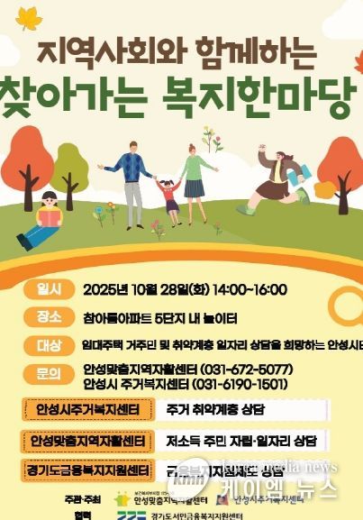 (케이엠뉴스) 안성시는 오는 10월 28일 오후 2시부터 4시까지 참아름아파트 5단지 내에서 ‘지역사회와 함께하는 찾아가는 복지 한마당’을 열고, 시민들을 대상으로 찾아가는 주거복지 이동상담소를 운영한다.